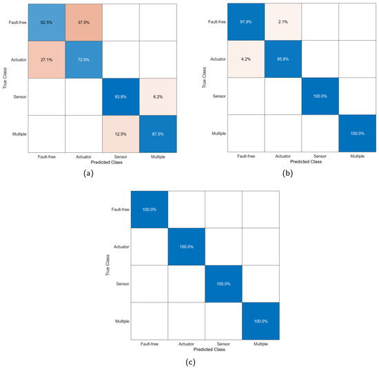 Once the features of the system states are obtained, they are classified in the MATLAB Classification Learner. In this work, four different classifiers are evaluated, and they were selected due to their diverse approaches to data classification. The classifiers considered were Bagged Trees (BTs), known for their ability to handle complex data by combining multiple decision trees; Cosine K-Nearest Neighbor (CKNN), which uses cosine-based similarity metrics to identify close patterns; Medium Neural Network (MNN), characterized by its ability to model non-linear relationships in data; and Linear Discriminant (LD), which offers a linear and efficient approach to class separation. This selection enables the exploration of different classification methodologies for fault diagnosis, providing a broad view of their applicability and effectiveness in this context. Figure 3 shows in a diagram the proposed fault diagnostic system.