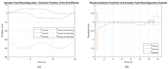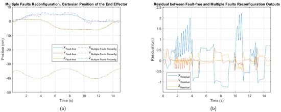 The maximum Lyapunov exponents were calculated in different scenarios to verify the stability of the control system. The first analysis was performed on the fault-free trajectory, introducing a cm variation in the initial position of the end effector for each coordinate axis. The second analysis was carried out considering the trajectory in the presence of a multiple fault, thus evaluating the worst condition analyzed. Finally, the third study evaluated the trajectory under the multiple fault, but after reconfiguring the active fault-tolerant controller, in order to confirm the stability of the system following the controller’s transition. The procedure for obtaining the Lyapunov exponents is detailed in Algorithm 3.