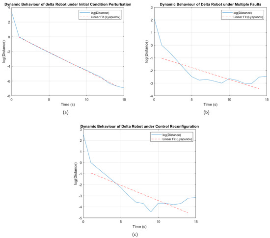 As a result of the tests carried out, Figure 17 was obtained, where it can be seen that, under the perturbation of initial conditions, without the presence of faults (Figure 17a), the curves maintain parallelism and show a negative slope, confirming stability in the system. In the case of Figure 17b, although there are oscillations in the logarithm curve, the decreasing trend is not interrupted, which indicates that the system is stable under the multiple fault analyzed. A similar behavior is observed in Figure 17c, obtained after the controller reconfiguration, where the curve represented in blue shows a consistent decreasing trend, even with fewer oscillations than those in Figure 17b, confirming improved stability.