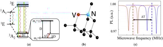 The NV center in diamond is a point defect characterized by a substitutional nitrogen atom and an adjacent vacant lattice site, exhibiting C3V symmetry [20]. This defect has a unique electronic structure that enables high-sensitivity temperature sensing. NV centers can be classified into two types based on their charge states: electrically neutral NV0 and negatively charged NV. Due to its excellent stability in photon emission and long spin coherence time [21,22], NV centers have attracted wide attention in the field of quantum sensing [23,24]. The diamond NV centers that this article focuses on is NV. Unless otherwise specified, all NV centers in the following text refer to NV centers. The energy levels of the NV centers consist of a ground state (3A2), an excited state (3E), and intermediate states (1A, 1E), with the ground state exhibiting a zero-field splitting (D) of ~2.87 GHz (Figure 1a). The zero-field splitting is highly sensitive to temperature due to lattice expansion and electron–phonon interactions [25]. When a 532 nm laser initializes the NV centers, electrons transition from the ground state to the excited state, emitting red fluorescence upon relaxation. The fluorescence intensity depends on the electron spin state, which can be manipulated using microwaves to achieve spin flipping between the ms = 0 and ms = ±1 states [26,27]. The ODMR spectrum, obtained by correlating fluorescence intensity with microwave frequency, reveals the zero-field splitting value (D), which shifts linearly with temperature (Figure 1c).