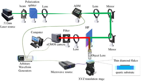 The optical system is responsible for initializing the NV centers and collecting fluorescence. A 532 nm laser (MGL-FN-532 laser-1W, Changchun Xingong Optoelectronics Technology Co., Ltd., Changchun, China) is used to excite the NV centers. The laser beam is shaped and directed through an acousto-optic modulator (AOM) and focused onto the diamond sample using a 10× objective lens (NA = 0.3). The spatial resolution is calculated as r = 1.22λ/(2NA) = 1.3 μm (λ = 670 nm), and the laser excites the diamond below the objective lens to induce fluorescence, where λ is the wavelength of the emitted red fluorescence (~670 nm). The fluorescence emitted from the diamond is collected by the same objective lens and directed through a 650 nm high-pass filter to eliminate background light. The filtered fluorescence is then detected by a CCD camera (Basler A602f) with a resolution of 1000 × 1000 pixels and a pixel size of 5 µm × 5 µm. The camera operates at a frame rate of 250 FPS, providing a wide-field imaging area of 500 µm × 500 µm.