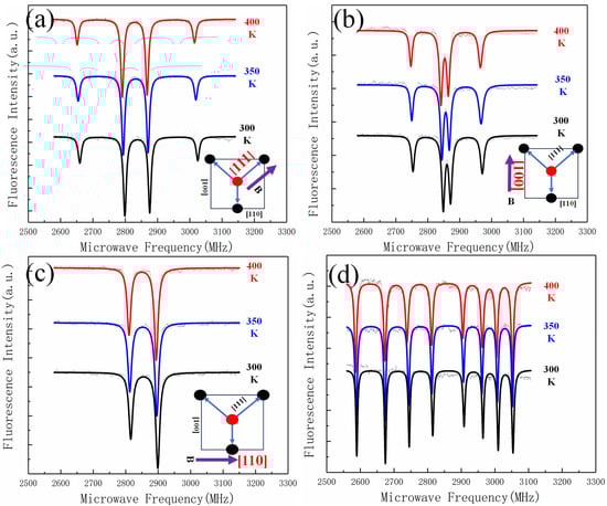 Figure 3. (ad) ODMR spectra with B∥ <111>, B∥<110>, B∥<100>, and B∥NO at 300 K, 350 K, and 400 K.