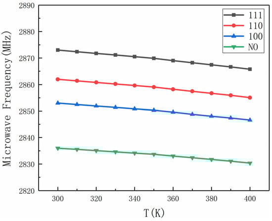 Here, at room temperature, βT is equal to −74 kHz/K [10], where ΔT represents the temperature change. However, the projection of the magnetic field on different NV axes is different; therefore, the frequency shift caused by temperature variation will also be theoretically different. The relative sensitivity is Δ f / f Δ T = 74   ppm / K , calculated from β T = 74   KHz / K and f = 2.87   GHz .