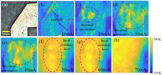 As the current increased further (shown in Figure 5c–e), thermal anomalies began to accumulate in certain regions within the chip. These anomalies were primarily caused by metal defects and surface scratches. Under high current conditions, these defects acted as hotspots, leading to localized temperature increases. At this stage, the system could be used for defect identification and detection in the chip, providing a powerful tool for chip quality control and reliability assessment.