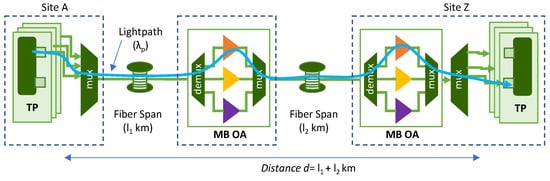 In this section, we consider a C+L+S MB transmission system such as the one illustrated in Figure 1, where a lightpath of total distance d connects sites A and Z using channel λp. The transponders (TP) include a transmitter (Tx) and a receiver (Rx), and we assume that it may operate in the different transmission bands. The generated signals are multiplexed and transmitted over the optical fiber, where MB optical amplifiers (OA) amplify the optical signal at every span. Two optical spans of lengths l1 and l2 can be observed in Figure 1. We consider an MB OA as a system with one OA per band, e.g., an EDFA for the C and L bands and a thulium-doped fiber amplifier (TDFA) for the S band, together with waveband (de)multiplexers.