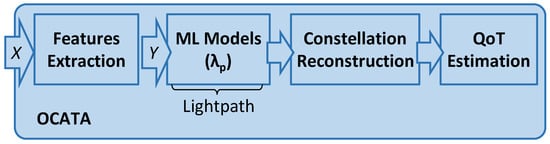 Figure 2 presents the OCATA DT architecture for MB, where incoming optical signals generated using modulation format m-QAM are processed in the time domain, i.e., IQ optical constellation samples X are used as inputs. Specifically, an input sample X consists of a set of symbols x ∈ X, where each x = [xI, xQ] belongs to one of the m distinct constellation points (CP). A feature-extraction (FeX) module computes a set of features Y characterizing each CP of the received signal by applying Gaussian mixture model (GMM) fitting [23] (see [19] for details). For such characterization, we assume that every CP follows a bivariate Gaussian distribution, so Y contains five features for each CP i, i.e., Yi = (y)i = (μI, μQ, σI, σQ, σIQ)i, where (1) μI and μQ represent the mean position for i over I and Q axes, respectively, and (2) σI and σQ are the variance of i over the axes and σIQ is the covariance between the axes. As was shown in [19], the dispersion of symbols belonging to each CP provides valuable insight of the level of both linear (LI) and NLI noise affecting the signal, which can be related to QoT-related indicators such as pre-FEC BER and SNR.