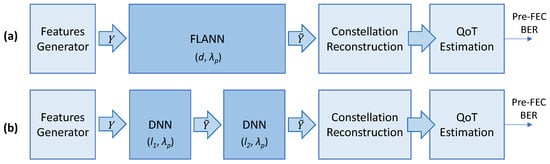 For illustrative purposes, Figure 3 shows the building blocks for the QoT estimation of the lightpath represented in Figure 1 that traverses two optical spans, each of 80 km. In Figure 3a, the FLANN end-to-end model predicts the features of the signal at the receiver in Site Z after the signal propagates on λp along d km. The constellation reconstruction block estimates the features of the nonpropagated CPs, and the QoT estimation block predicts the pre-FEC BER. In Figure 3b, two span DNN models trained to signal propagation on λp along l1 and l2 km are concatenated to model the end-to-end lightpath. All the blocks except the models themselves are common for both approaches.