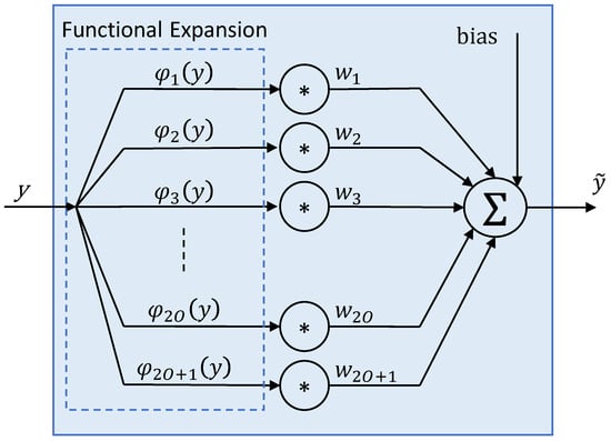 Each feature model consists of a functional expansion block, where each input feature y is extended to capture its nonlinear behavior. In particular, in this paper, we assume that the functional expansion is based on trigonometric functions φ(·)(y), except φ1(y) = y. Next, each output of the expansion block is multiplied by a weight w(·). Because no activation function is used, the estimated value of the feature is given by Equation (25), where O is the order of the FLANN model: