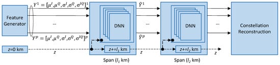 The DNN link models had (i) 21 inputs, i.e., one additional input for accumulated distance, (ii) two hidden layers with 12 neurons and a tanh(·) activation function, and (iii) 20 outputs for the propagated features for the optical span, and (iv) they were trained with Adam as an optimization algorithm, with a learning rate of 10−3 and mean squared error as a loss function for up to 1000 epochs with a batch size of 64.