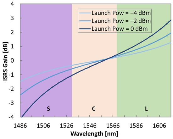 Figure 7 shows the ISRS gain profile after fiber propagation by executing the A-RK_ω method for launch powers of −4, −2, and 0 dBm per channel, i.e., 21.27, 23.27, and 25.27 dBm of total launch power, respectively. A decrease in the ISRS gain tilt from around 7 to just 3 dB was observed as the total input power decreased. Note that even for launch powers as low as −4 dBm per-channel, the impact of ISRS was still noticeable.