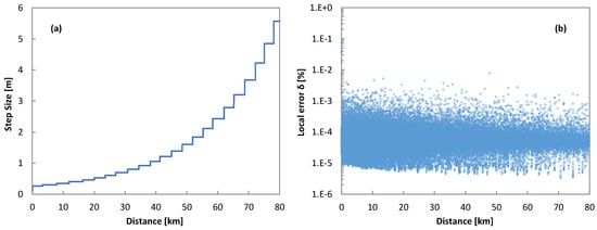Figure 8a plots the adaptation of the step size, as provided by Algorithm 1, and Figure 8b plots the error, computed as Equation (21), with the propagated distance. We observe that the adaptive step size algorithm provided good accuracy by fixing small step sizes during the initial propagation and then relaxing the step size when the propagated distance increased.
