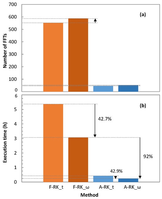 Number of FFTs required (a) and total computation time (b) of RK4IP methods.