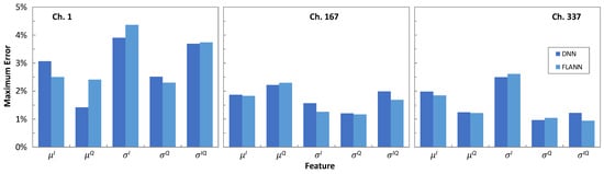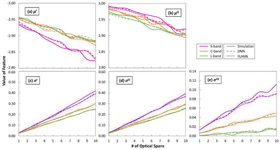 Figure 10 plots the evolution of the features μI, μQ, σI, σQ, and σIQ characterizing the bivariate Gaussian distribution of the exterior CP [−3 + 3i], with the propagation distance in terms of optical spans as obtained from the simulator and predicted by the ML models. In general, the values of the features changed almost linearly with the distance, which was likely due to the simplicity of the trained ML models, i.e., order 2 for the FLANNs and two hidden layers with 12 neurons for the DNNs. With these very simple structures, the predicted features were very close to the ones from simulation. Figure 11 shows the maximum absolute error between the features predicted by the ML models w.r.t. the ones from simulation for CP [−3 + 3i]. In all cases, the error was smaller than 5%.