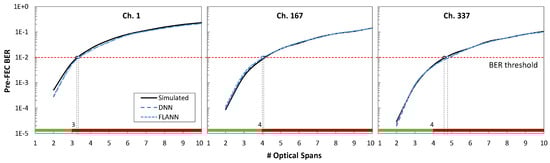 Figure 13 plots the pre-FEC BER as a function of the span count for the three channels under analysis. The results show that the models could closely predict the actual QoT for all the channels. We observe remarkably high accuracy in both ML models for QoT estimation. In particular, both models can be used to anticipate whether a candidate route and wavelength assignment will meet the required QoT. Note the importance of wavelength selection for the different channels under analysis, where a lightpath assigned with channel 1 was able to provide pre-FEC BER values only under the threshold of three or fewer spans, while channels 167 and 337 could support one more span.