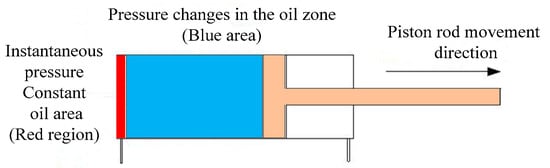 To illustrate the pressure distribution within the non-rod chamber during the extension motion of a double-acting single-piston-rod hydraulic cylinder, a schematic diagram is presented in Figure 1. The red region represents the hydraulic fluid that instantaneously enters the non-rod chamber. Due to the extremely short time interval, the pressure in this region can be assumed to remain constant. During the extension of the piston rod, external loads typically exhibit fluctuations or even significant variations, causing the hydraulic fluid in the blue region of the non-rod chamber to undergo compression or expansion. This results in displacement errors in the motion of the piston rod. Therefore, it is necessary to establish a mathematical model for the volume of fluid compressed or expanded per unit time and analyze it precisely. To facilitate calculations, the displacement error of the piston rod caused by fluid compressibility is quantified in terms of flow loss.