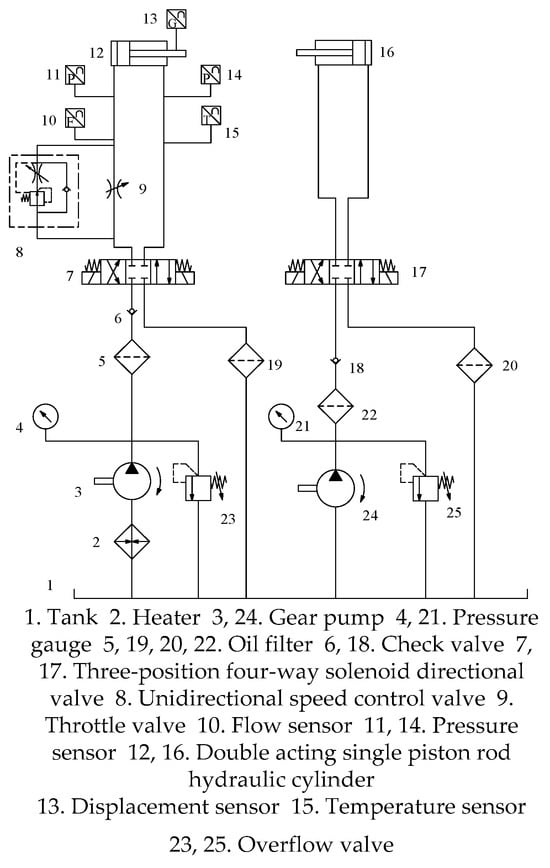 The experimental time of day and the time interval of each experiment should be strictly controlled to prevent different indoor temperatures and system heating from interfering with the hydraulic oil temperature in the experiment. Based on the principal diagram of the experimental hydraulic system shown in Figure 3, the specific experimental steps are as follows:
