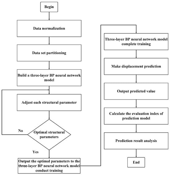After following the above experimental steps, the experiment is completed, and a displacement dataset under different pressures, flow rates, and temperatures is obtained. After integrating the experimental data, 2500 sets of data were finally obtained, with 42 tables in each group. The table data include the sensor signal data of the non-rod chamber pressure, rod end chamber pressure, hydraulic oil inlet flow rate, temperature, and displacement. The data were subjected to a series of preprocessing steps, which included the imputation of missing values, the detection and treatment of outliers, and the removal of duplicate entries. These data cleansing procedures were implemented to ensure the accuracy and consistency of the dataset. Subsequently, data normalization was carried out, scaling the data to a uniform numerical range in order to eliminate the dimensional disparities among different features, thereby enhancing the model’s learning efficiency and predictive accuracy. Ultimately, the dataset was partitioned into three subsets in a 6:2:2 ratio, designated as the training, validation, and test sets, respectively. A comprehensive flowchart delineating the predictive process of the three-layer BP neural network is presented in Figure 4.