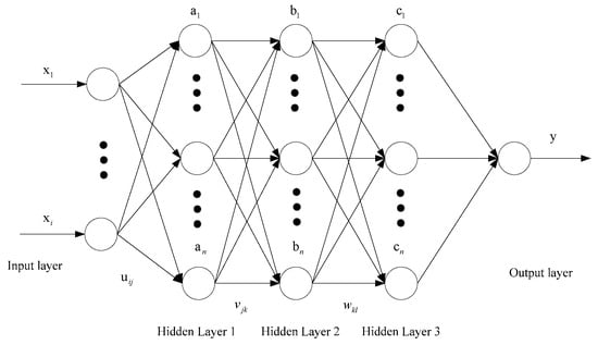 Here, is the number of nodes in the hidden layers; is the input vector; is the weight from to the first hidden layer neuron ; is the weight of neuron from to the second hidden layer; is the weight from to the third hidden layer neuron ; is the bias of ; is the offset of ; is the bias of ; is the activation function for each hidden layer; and is the output vector.
