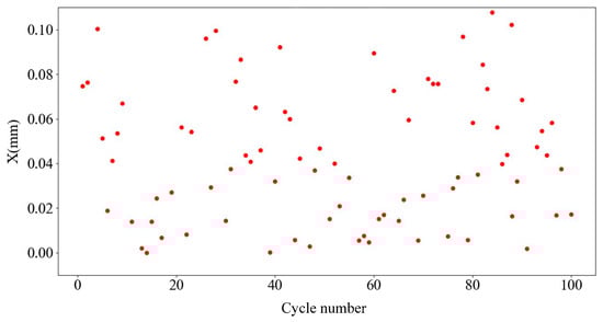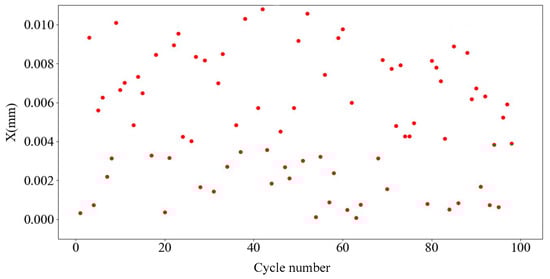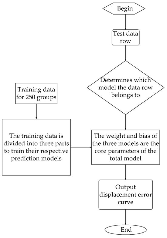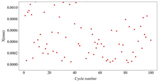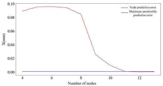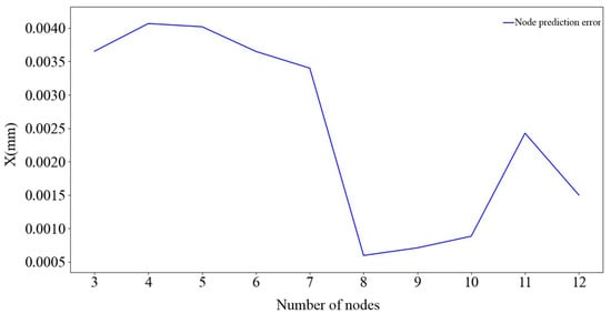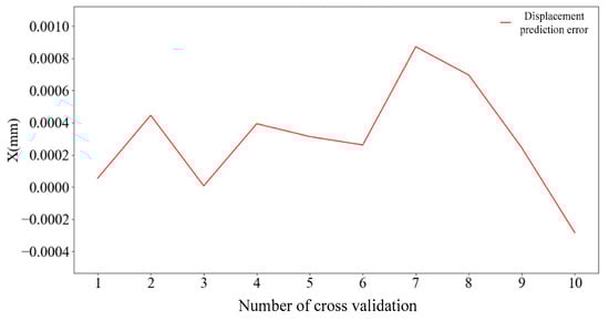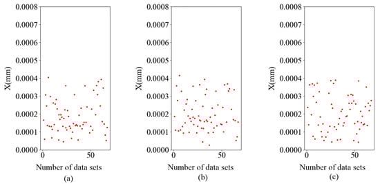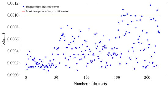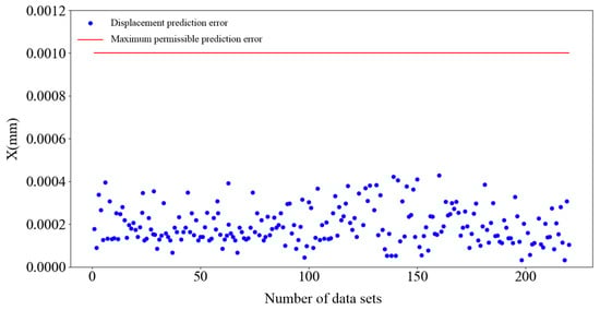 As can be seen in Figure 16, the average error point distribution of each table is below 4.5 × 10−4 mm, and the average error of data error points in the three subgraphs is 1.8909 × 10−4 mm, 1.8911 × 10−4 mm, and 2.024 × 10−4 mm, respectively. The accuracy of the three prediction models is within the expected range, and they are more accurate than the prediction model before optimization. Finally, the weight and bias of the updated three prediction models were output.