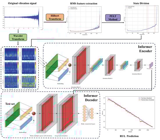 The specific process of the bearing RUL prediction method based on PELT state division and time-frequency diagram is shown in Figure 1. First, feature extraction is performed on the original vibration signal of the rolling bearing to obtain the RMS feature curve and the feature spectrum. Then, the PELT algorithm is used to monitor the change points of the smoothed RMS feature curve of the bearing vibration signal (i.e., the locations where the statistical characteristics of the data change significantly) for state division. Finally, the segmentation results are applied to the time-frequency diagram and input into the Informer bearing life prediction network for training, achieving segmented fitting and realizing a more efficient and accurate prediction of bearing RUL.