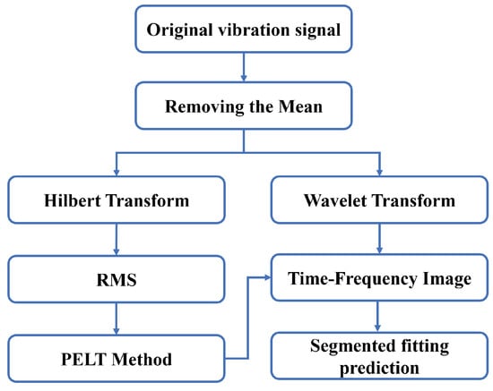 The raw vibration signal of rolling bearings exhibits relatively stable characteristics during normal operation, with slow variations. However, this also makes RUL prediction more challenging [33]. In the evaluation of rolling bearing degradation and remaining useful life prediction, it is crucial to preprocess the raw data and select appropriate features to characterize the performance degradation trend. Degradation features can serve as health indicators to detect the onset of the degradation phase, thereby distinguishing between the healthy and faulty states of the bearing. The preprocessing process of the raw vibration signal for rolling bearings in this paper is shown in Figure 2. After mean removal, the raw vibration signal is processed in two ways: on the one hand, the Hilbert transform is applied to extract the envelope of the signal for degradation feature extraction; on the other hand, time-frequency images of the full life cycle of the bearing are obtained through wavelet transform and other methods. The degradation feature curves will be used for subsequent bearing health state classification, while the time-frequency images, classified based on the state division results, will be used for further segmented prediction of bearing life.