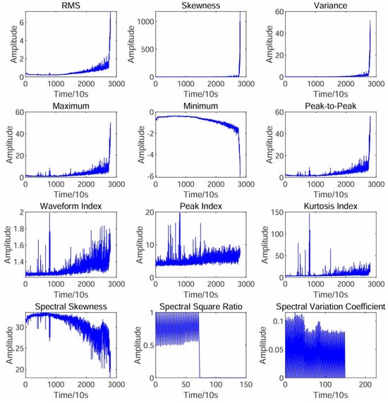 In this paper, 12 time-frequency domain degradation features, including root mean square (RMS), skewness, waveform index, frequency skewness, and others, are extracted based on the signal envelope. The feature curves are shown in Figure 3. Among them, the RMS curve exhibits better monotonicity, trend correlation, and robustness compared to other feature curves, making it more suitable as a representation of the bearing degradation process.