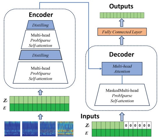 When using time–frequency images as input for the Informer model, the image needs to be divided into N patches of fixed size. Each patch is then flattened into a one-dimensional vector and projected into a d-dimensional feature space through a learnable linear mapping W, resulting in the input sequence that the Informer model can process, . However, since the Informer structure itself does not inherently capture temporal information, position encoding E is introduced, leading to the final network input, .