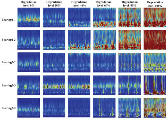Figure 7 shows the image features of the acceleration sensor signals of several typical bearings over the entire lifespan. Clearly, the energy distribution of the vibration signals in the time–frequency domain changes with the occurrence of faults, and the image features clearly display the degradation process of all the bearings.