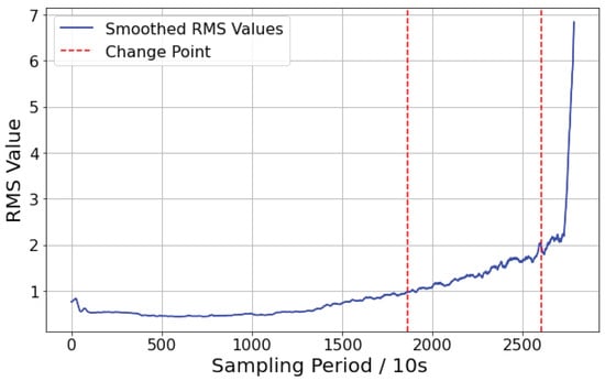 After obtaining the RMS curve, the PELT (Pruned Exact Linear Time) method is applied for bearing degradation state segmentation. PELT is an efficient change-point detection algorithm widely used in time-series analysis. It can quickly identify positions where significant changes occur in statistical characteristics such as mean and variance. The method has been applied in various fields, including finance, signal processing, and bioinformatics [34,35].