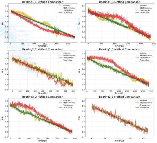 This paper selects three models—Transformer, Informer, and Informer based on PELT result segmentation fitting—to compare the prediction results on the Bearing1-1, Bearing1-3, Bearing2-2, Bearing2-3, Bearing3-2, and Bearing3-3 bearing datasets. The network model is implemented using Python 3.7, and the testing is conducted on a server equipped with an RTX-3060 GPU (NVIDIA Corporation, Santa Clara, CA, USA). and a 12th generation Intel Core i7-12700H 2.70 GHz CPU (Intel Corporation, Santa Clara, CA, USA). The input sequence length is set to 100, prediction length to 20, hidden layer dimension to 256, number of attention heads to 8, number of layers to 6 for both the encoder and decoder, attention dimension to 128, dropout rate to 0.2, batch size to 32, learning rate to 1 , and the optimizer used is AdamW.