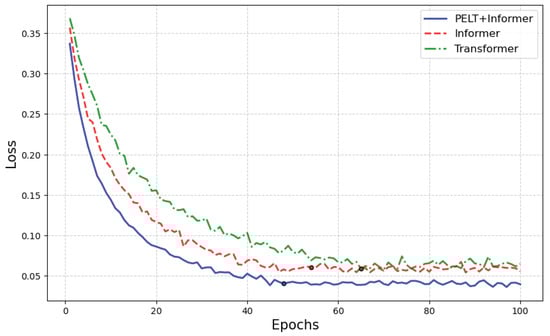 Additionally, as shown in Figure 10, the Informer model, which performs segmented life prediction based on the PELT bearing degradation state division results, has a smaller loss value between the predicted and actual values compared to the other two models. It also achieves convergence with fewer iterations (the “dots” in Figure 10 indicate the points where the model’s predictions no longer show significant changes as training progresses), demonstrating higher computational efficiency and the potential to save computational resources to some extent.