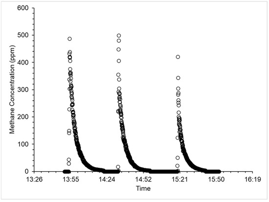 Following the calibration experiments, the sensors’ response was tested against short-duration plumes of methane. The TDLAS responded to the methane plumes within 5 s of the plumes being initiated 0.5 m away, note that the WATCH4ERS unit updates concentrations every 5 s (Figure 4). This suggests the TDLAS response is faster than the refresh rate of the WATCH4ERS unit. Reported methane concentrations were between 5 and 7 ppm for all experiments, which is in line with modeled values for a 1 g CH4 h−1 released 0.5 m away and traveling at 3.5 m s−1. The reported peaks also last the same amount of time as the emissions.
