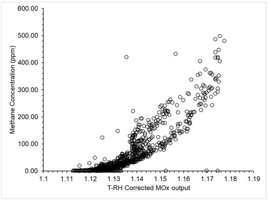 The metal oxide (MOx) temperature and humidity corrected output sensor output data plotted against the TDLAS methane concentration data (ppm). The MOx sensor voltage output, as measured by the potential divider circuit (Supplementary Material Section S1 Figures S1 and S2; with data capture described in Supplementary Material Section S3.1) was corrected for the effects of temperature and relative humidity and used to calculate the relative resistance of the metal oxide strip (Rr, Supplementary Material Section S4 Equation (S1)). The R2 between the TDLAS and MOx data over the two hours of calibration was 0.77.