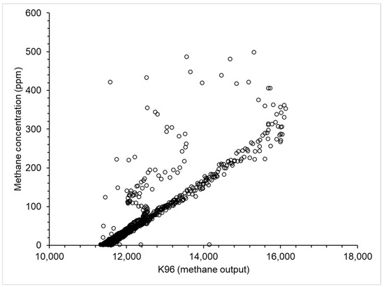 Methane mixing ratios were also measured by a Southern Cross Inc. (Norcross, GA, USA) ’46 Hawk tunable diode laser absorption spectrometer (power consumption 1.5 W). The ’46 Hawk is a methane-specific instrument that draws air into the cavity of the handheld unit at a rate of 1.2 lpm and methane mixing ratios are reported every second [46]. The response time of the ’46 Hawk is 2 s and can measure methane concentrations between 1 ppm and 100% gas with a sensitivity of 1 ppm. Gas measurements made by the ’46 Hawk are only displayed on an LCD screen and an Arduino-based interface was designed to capture and decode the displayed measurements. This information was then transferred through an RS232 interface to the data-logging PC. The sampling inlet of the ’46 Hawk was collocated (within 5 cm) with the TGS, INIR, and K96 sensors.