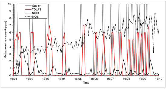 Sensor response (methane concentration, ppm) to methane released at 1 g CH4 h−1 released 0.5 m away and traveling at 3.5 m s−1. Sensors used were the metal oxide (MOx; black dashed line), Non-dispersion Infrared (NDIR; solid black line), and tunable diode laser absorption spectrometer (TDLAS, solid red line) sensors. The solid grey line, “Gas on”, shows when the gas was turned on (positive value) and tuned off (zero).