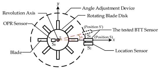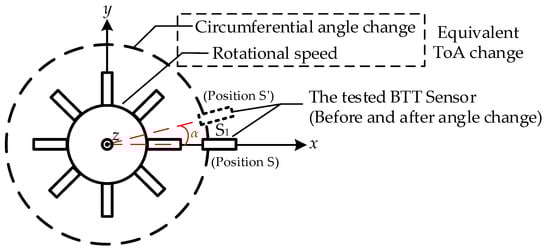The change in circumferential angle causes the tested BTT sensor S1 to rotate by an angle of α. The theoretical value of the ToA before and after the same blade reaches S1 is calculated as