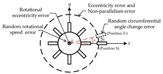 From Equation (26), the relationship between γ, α, and β is established. The eccentricity error, non-parallelism error, and rotational eccentricity error contribute to the overall discrepancy expressed as γ-α.
