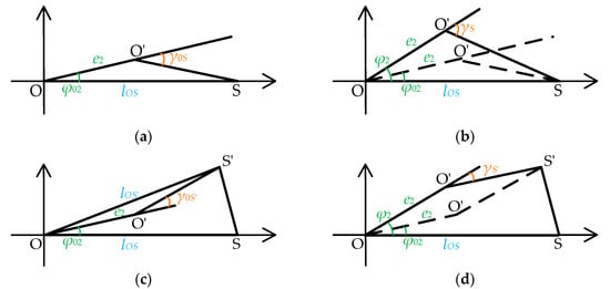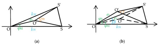 Combining Figure 6a–d, the relationship between the rotation angle β of S1 and the measurement angle γ is illustrated in Figure 7. Specifically, Figure 6a,c are combined to form Figure 7a, while Figure 6b,d are combined to form Figure 7b. By consolidating these cases, the mathematical relationship between the relative positions becomes clearer. Figure 7a represents the relative position without rotation, while Figure 7b represents the relative position of the rotation.