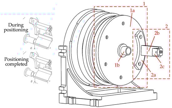Coaxial positioning device and the tested BTT sensor fixture, where 1—coaxial positioning device; 1a—connection part; 1b—coaxial positioning adjustable part; 2—the tested BTT sensor fixture; 2a—fixing part; 2b—blade proximity part; 2c—clamping part.