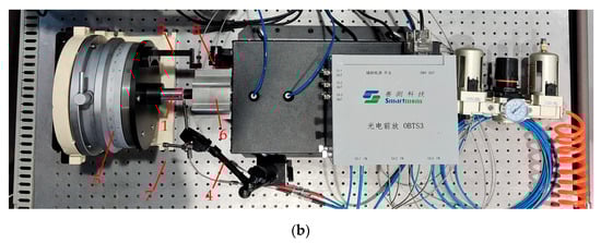 BTT accuracy evaluation device, where 1—coaxial positioning device; 2—the tested BTT sensor fixture; 3—location sensor fixture; 4—OPR sensor fixture; 5—multi-tooth dividing table; 6—rotating blade disk test bench; 7—optical platform: (a) overall structure; (b) physical object.
