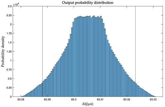 Based on Table 1, the MCM is used to evaluate the uncertainty of the BTT accuracy evaluation device. The probability distribution of the output, represented by the theoretical ToA value Δtj, is shown in Figure 11. The results indicate that at 0.5° and 1000 rpm, the estimated value is 83.3055 μs, with the standard uncertainty of 8.824 × 10−3 μs. The 95% confidence interval, indicated by the two vertical lines, is [83.2881, 83.3233] μs. The figure demonstrates that the error follows a trapezoidal distribution.