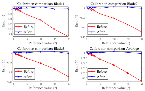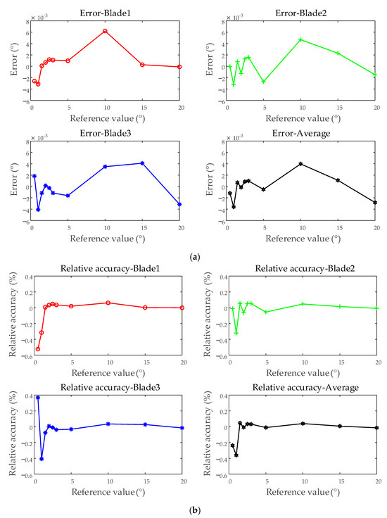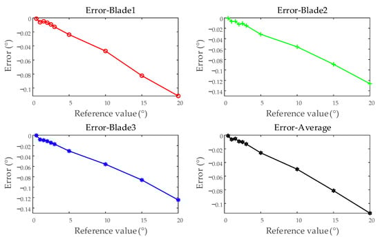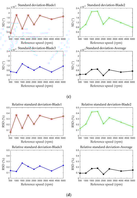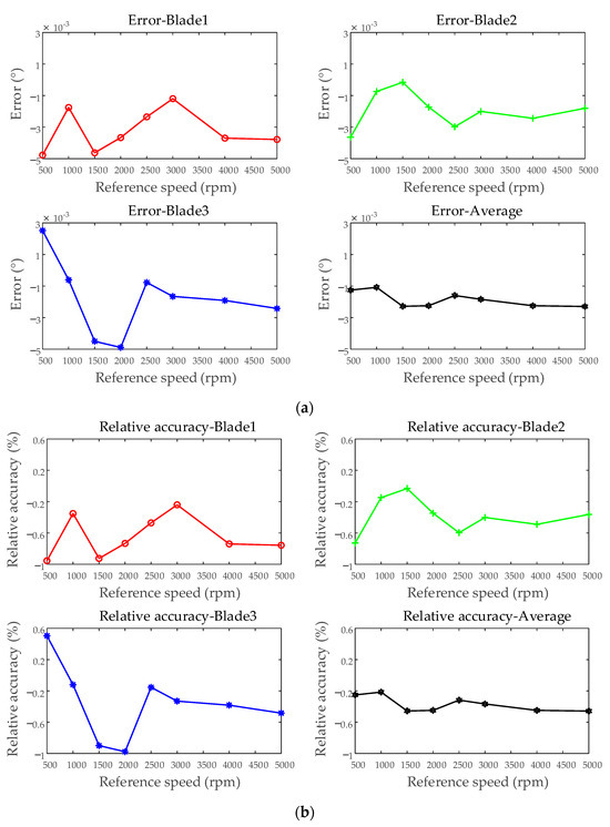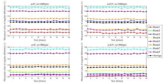 The test results for a single blade are shown in Figure 12, using Conditions 1, 2, 12, and 13 as examples. In each condition, differences in the angle difference measurements of different blades are observed. These variations are attributed to differences in blade length and angular distribution during the manufacturing process. Comparing Conditions 1 and 12, differences are also noted in the measured values of the same blade at different speeds. These discrepancies arise from variations in data processing within the BTT measurement system at different speeds. Signal noise and sampling rate of the BTT measurement system lead to differences in ToA obtained through different noise reduction and ToA extraction methods. The method and device proposed in this paper rely on the rotation angle of the multi-tooth indexing table. The OPR sensor distinguishes different blades, while the location sensor handles differential processing. The rotational speed is controllable, and fluctuations are negligible, ensuring that the aforementioned differences do not impact the test results.