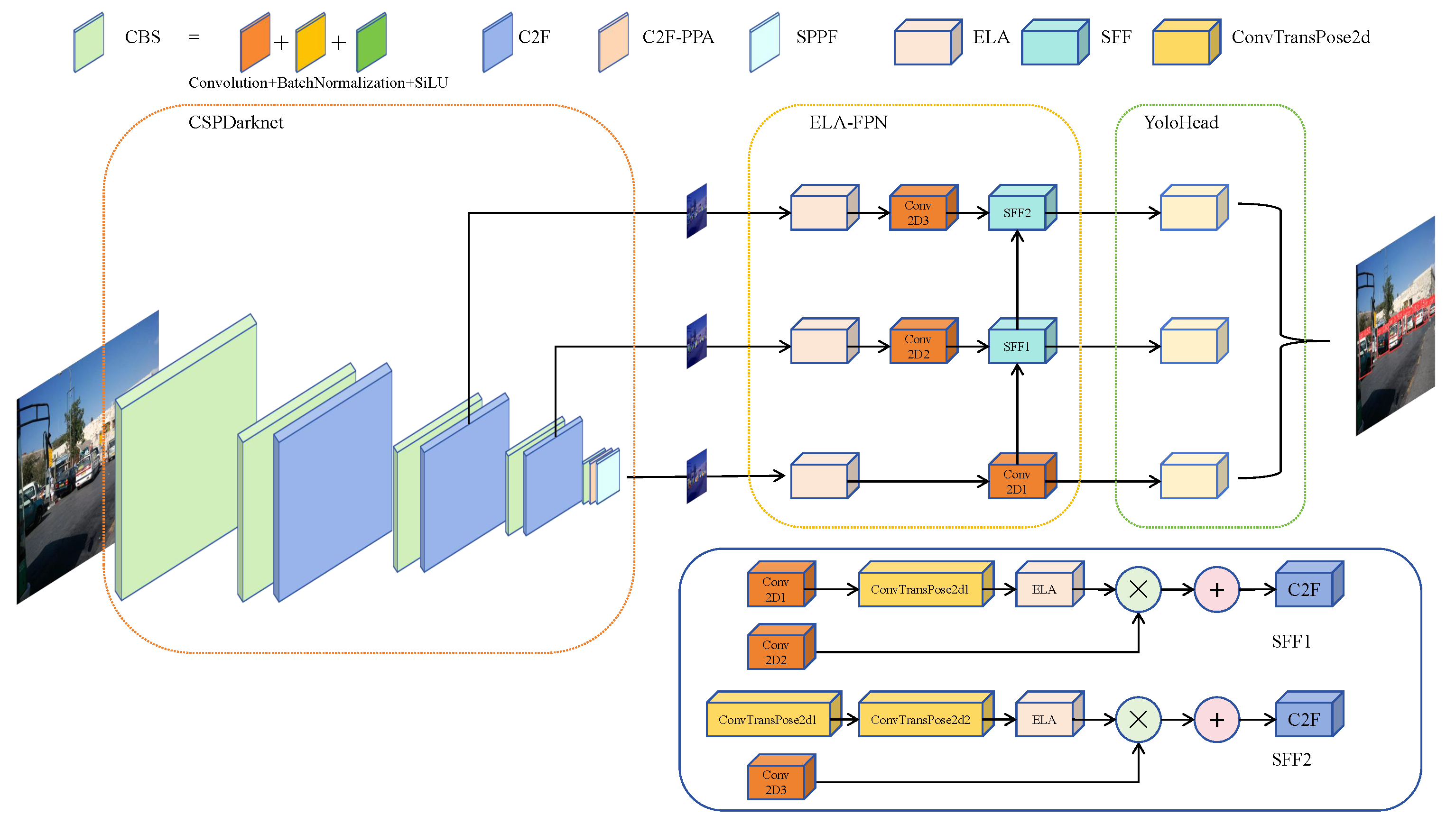 - An Enhanced Local Attention Feature Pyramid Network (ELA-FPN) is proposed to address the multi-scale challenges in vehicle detection. ELA-FPN enhances feature selection and fusion capabilities through 1D convolutions and uses Group Normalization (GN) instead of Batch Normalization (BN), which improves the model’s generalization ability, reduces model size, and increases processing speed.