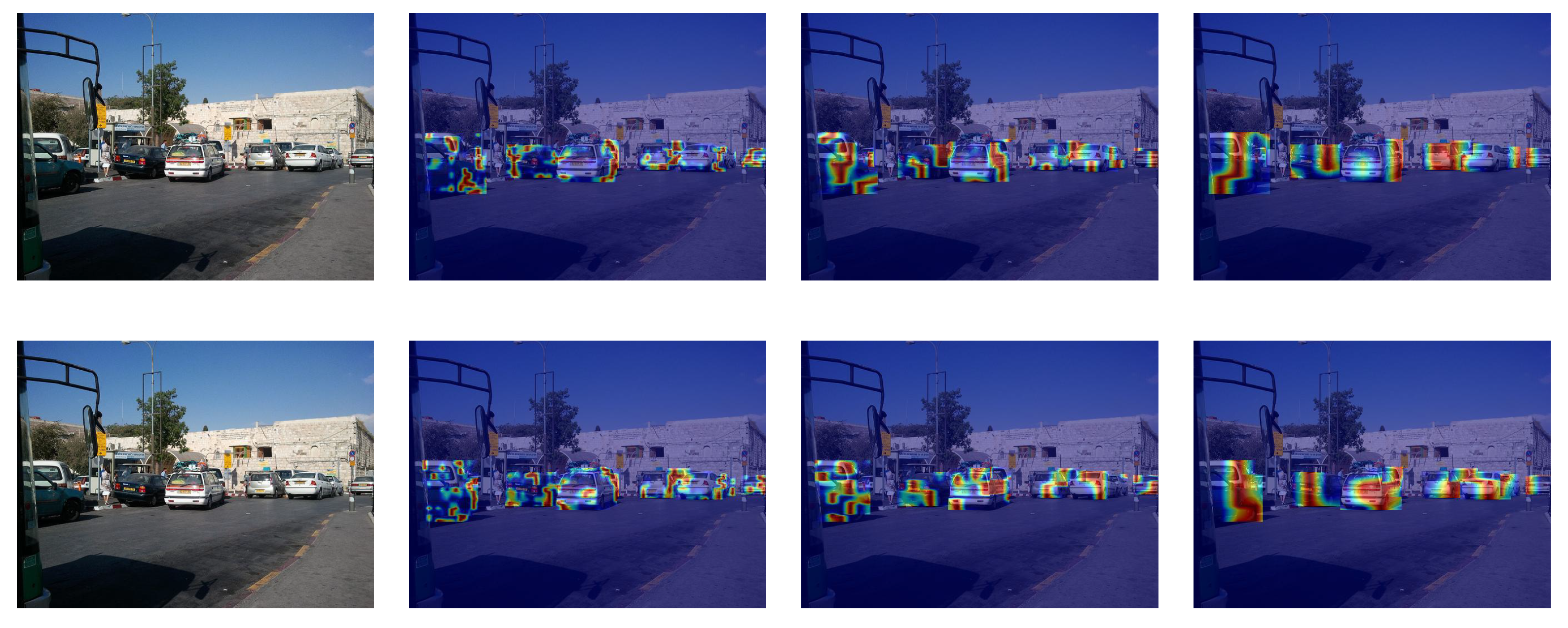 The feature maps extracted from CSPDarkNet53 (top) and the improved CSPDarkNet53 (bottom) are visualized. From left to right, the visualizations display the original image, heatmaps of feature 4, feature 6, and feature 9, respectively.