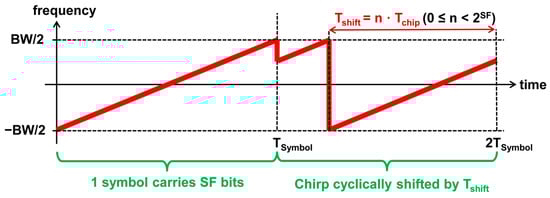 Long-range (LoRa) modulation is a chirp spread spectrum (CSS) modulation that was developed by the Semtech Corporation [22] and has become popular for IoT applications. Each symbol consists of a cyclically shifted frequency ramp with a bandwidth , as shown in Figure 1.