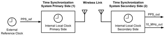 Compared to optical free-space links, wireless time synchronization systems using radio frequency (RF) signals are less influenced by atmospheric conditions and can, in principle, also be employed without a direct line-of-sight link between the two terminals. There is a large amount of previous work on wireless time synchronization for sensor networks, with typical accuracies in the µs level, for example [7,8]. Other work on wireless time synchronization focuses on short-range wireless time synchronization, for example, using ultra-wideband (UWB) technology, with reported accuracies in the ns range [9]. In [10], a wireless system for positioning and time synchronization operating in the 2.4 GHz industrial, scientific and medical (ISM) band is evaluated, with a reported maximum time interval error (MTIE) of 3 ns averaged over multiple distances of up to 105 km.