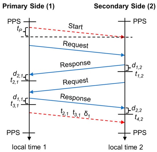 The timestamps are measured using local unsynchronized clocks (a free running timer on the primary and secondary side), as the controller only moves the position of the one-second period start to synchronize the local clock on both sides. The one-second period start corresponds to the positions of the PPS marker shown in Figure 3. This PPS marker corresponds on the secondary side to the synchronized time information. It should be noted that Figure 3 shows the synchronized state, where the PPS marker positions of the primary and secondary side have been aligned. Therefore, the local timestamps from the free running timers must be corrected to reflect the correction of the control algorithm on the local clock. For the local time on the primary side (1) as an example, this corrected time is