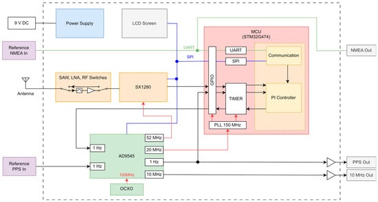 The internal and external clock signals are generated within an Analog Devices AD9545 “1 PPS synchronizer and jitter cleaner” using an Abracon AOCJY3A 100 MHz oven-controlled crystal oscillator (OCXO) with a rated frequency stability of 10 ppb. The 52 MHz clock for the LoRa transceiver and the 20 MHz clock for the MCU are generated from a primary analogue phase-locked voltage-controlled oscillator (VCO) that is linked to the OCXO, while the 1 Hz PPS and 10 MHz output signals are derived from a secondary phase-locked loop (PLL) with a VCO running at 2.46 GHz. This secondary PLL digitally compares the divided 1 Hz PPS output with a 1 Hz reference input and disciplines the underlying analogue PLL, which is also linked to the OCXO. This secondary PLL contains a 10 mHz loop filter used to clean up the signal by reducing the jitter and quantization noise of the output 1 Hz PPS signal. The OCXO and AD9545 are the main energy consumers, having a total steady state power consumption of 3 W.