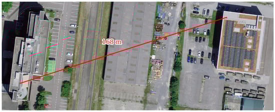 The time synchronization system is set up with a line-of-sight link distance of about 170 m between the roofs of the two buildings shown in Figure 6. There was additionally several meters of coaxial RF cable between the antennas and time synchronization system devices. In the first setup, two 10 dBi directional patch antennas were used on both sides of the wireless link. In the second setup, the primary side used the same 10 dBi directional patch antenna while the secondary side used an omni-directional rod antenna with a gain of 2 dBi. Even though no channel measurements were conducted, in the second setup, a more pronounced multipath propagation is expected compared to the first setup. The equipment was set up in a weather-protected environment at both ends (container room at the secondary side and a metal box at the primary side), but without temperature control.