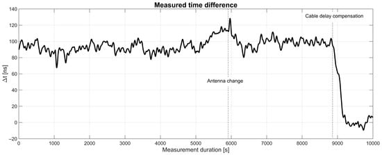The first 5900 s was recorded with the first setup using patch antennas at both sides of the wireless link, at which point the antenna on the secondary side was swapped for an omni-directional rod antenna. This second setup was active starting at 6000 s. It can be observed from Figure 7 that there is no obvious change in the behavior of the time difference when using the second setup with an omni-directional antenna on one side.